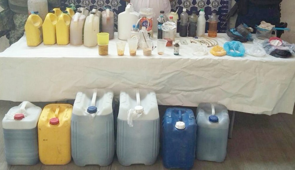 Buenavista Tomatlán, Michoacán., miércoles 26 de octubre de 2016.- Elementos de la Secretaría de Seguridad Pública (SSP) en coordinación con efectivos de la Secretaría de la Defensa Nacional (Sedena) aseguraron un laboratorio clandestino para elaboración de droga sintética en la localidad de La Ruana del municipio de Buenavista Tomatlán.