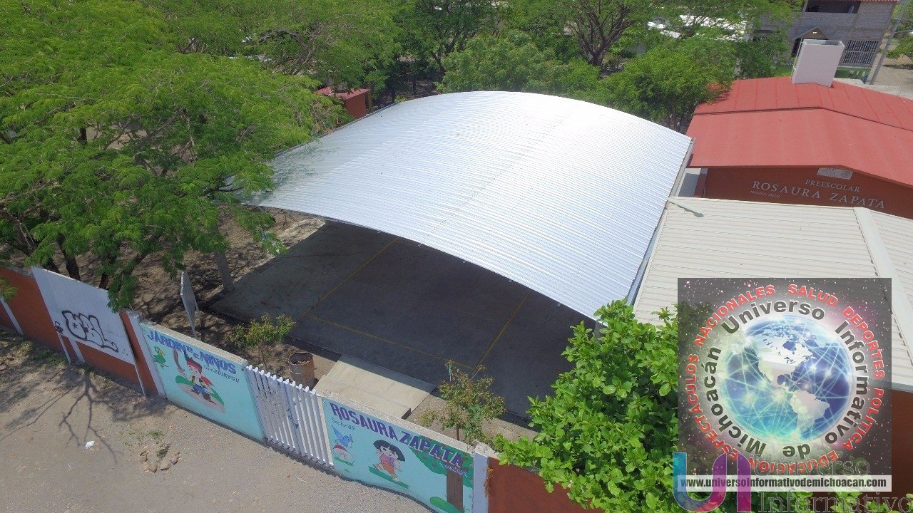 Tras una serie de peticiones por parte de padres de familia y de personal que labora en esta institución educativa, el Gobierno Municipal de Múgica, trabajo en la construcción de esta estructura de 180 metros cuadrados, y que comprende todo el patio de la escuela.