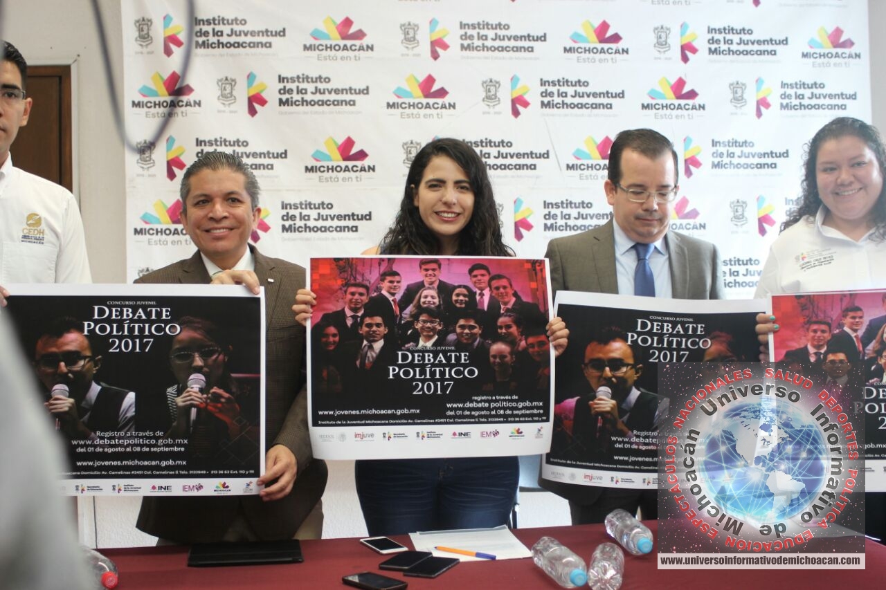 Morelia, Michoacán; a 25 de agosto de 2017.- De manera oficial este viernes el Instituto de la Juventud Michoacana (Ijumich), en colaboración con el Instituto Nacional Electoral (INE) y el Instituto Electoral de Michoacán (IEM) presentaron la convocatoria del Concurso Estatal de Debate Político 2017.