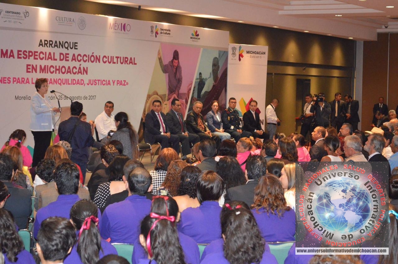 Morelia, Michoacán, a 25 de agosto de 2017.- La cultura ha comenzado a redefinir su papel frente a la economía y al desarrollo; poco se duda acerca de su importancia como generadora de desarrollo y cohesión social, de su relevante papel ante la cuestión de la diversidad cultural, la integración de comunidades minoritarias, los procesos de igualdad de género y la problemática de las comunidades urbanas y rurales marginadas. En este contexto, este viernes fue puesto en marcha el Programa Especial de Acción Cultural: México Cultura para la Armonía en Michoacán.