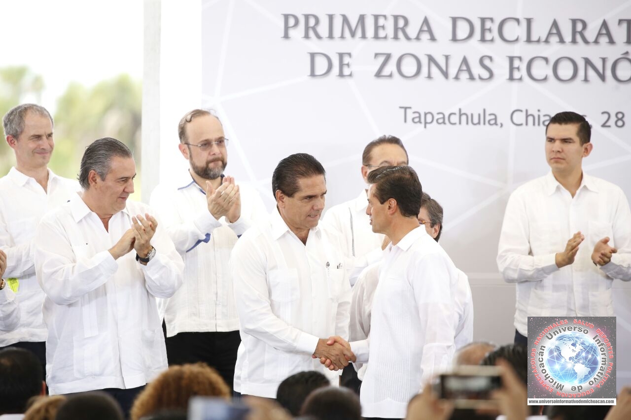 Puerto Chiapas, mpio. De Tapachula, Chiapas, a 28 de septiembre de 2017.- La declaratoria de la Zona Económica Especial (ZEE) de Lázaro Cárdenas, Michoacán, y La Unión, Guerrero, marcará un parteaguas para nuestro estado, pues dinamizará la economía, ya que se consolidará el binomio de la competitividad, aseguró el Gobernador Constitucional Silvano Aureoles Conejo.