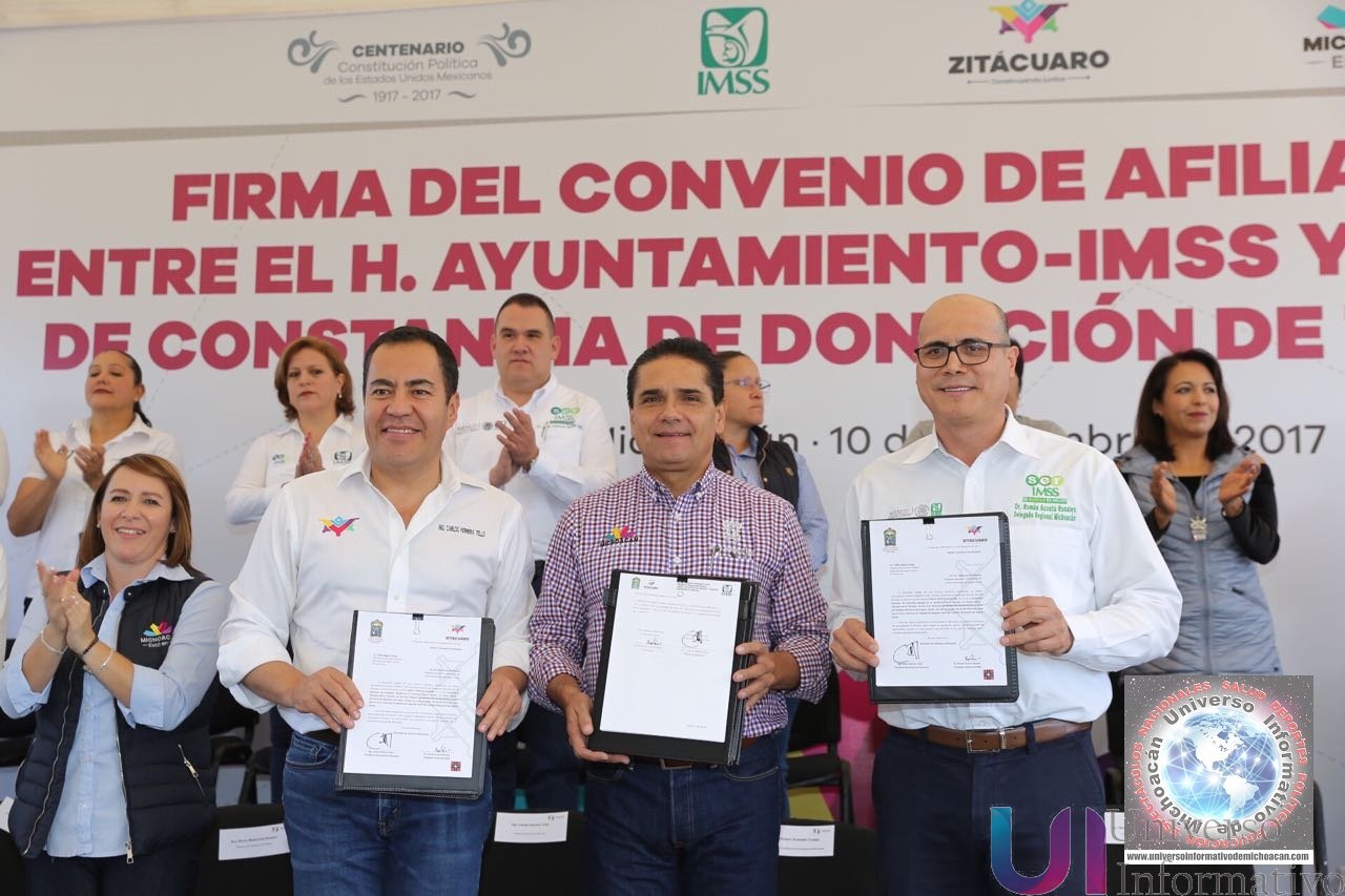 Lo anterior, luego de que el Ayuntamiento de Zitácuaro y la delegación del IMSS signaron el Convenio para la Inscripción de Trabajadores y entrega de escrituras de terreno para la construcción del Hospital de Segundo Nivel.