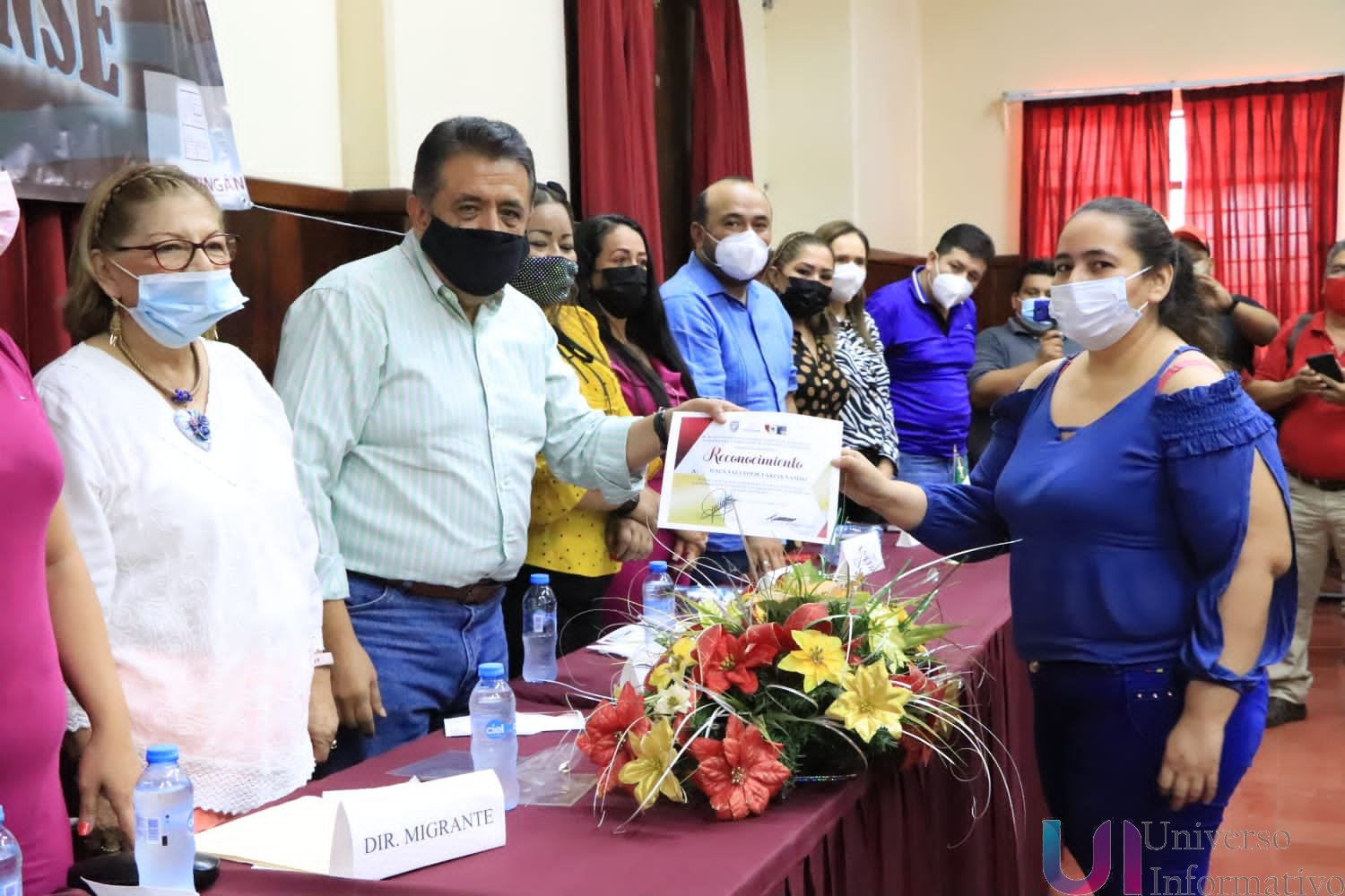 Finalmente, las autoridades encabezadas por el presidente y la presidenta del DIF, Minerva Guízar Brito, entregaron reconocimientos a las personas que realizaron algún trámite en las oficinas del Migrante