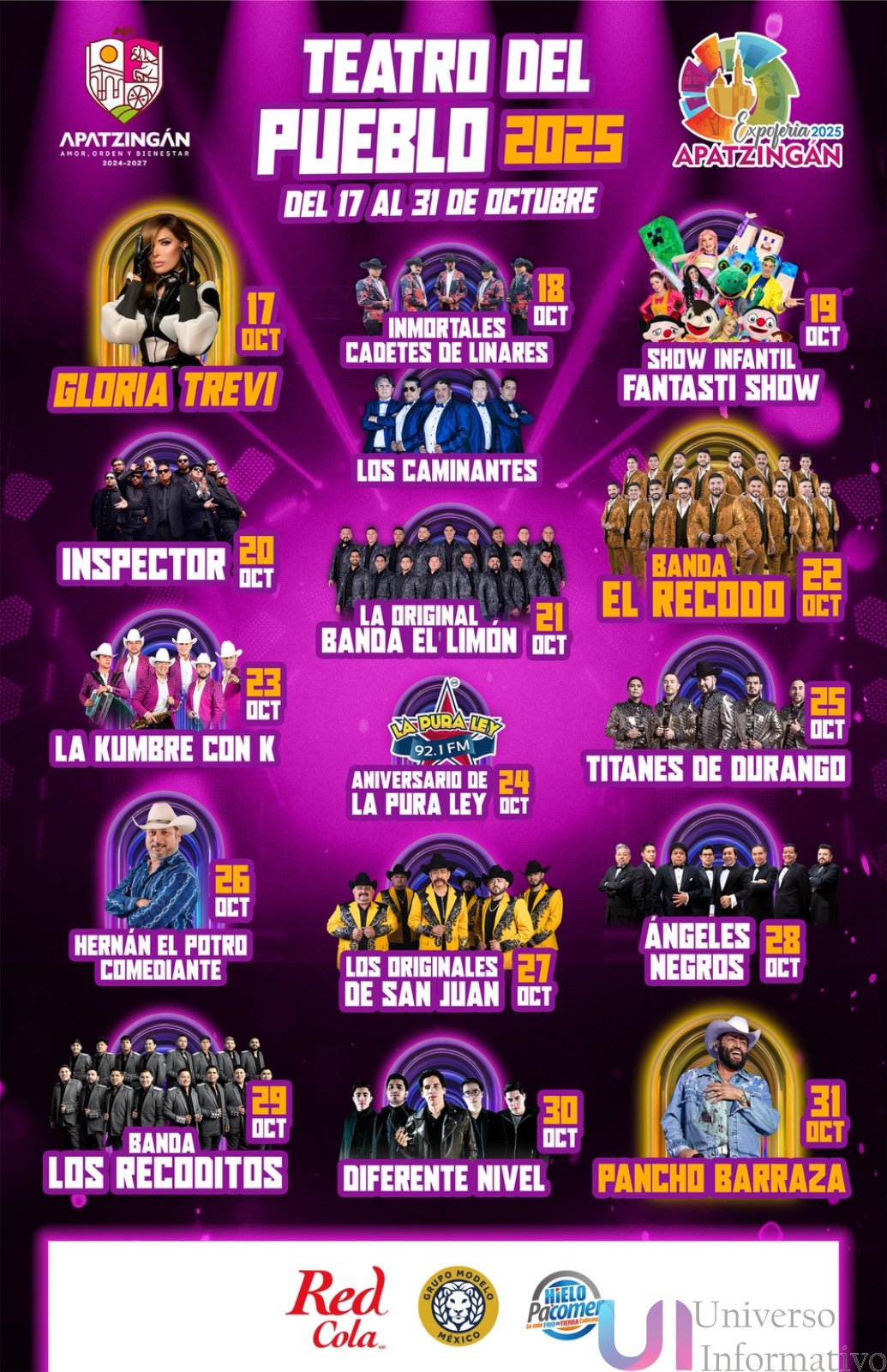 Apatzingán, Michoacán; 16 de septiembre de 2025:-El Gobierno Municipal de Apatzingán presentó la cartelera oficial del Teatro del Pueblo 2025, que se llevará a cabo del 17 al 31 de octubre como parte de las tradicionales Fiestas Octubrinas.