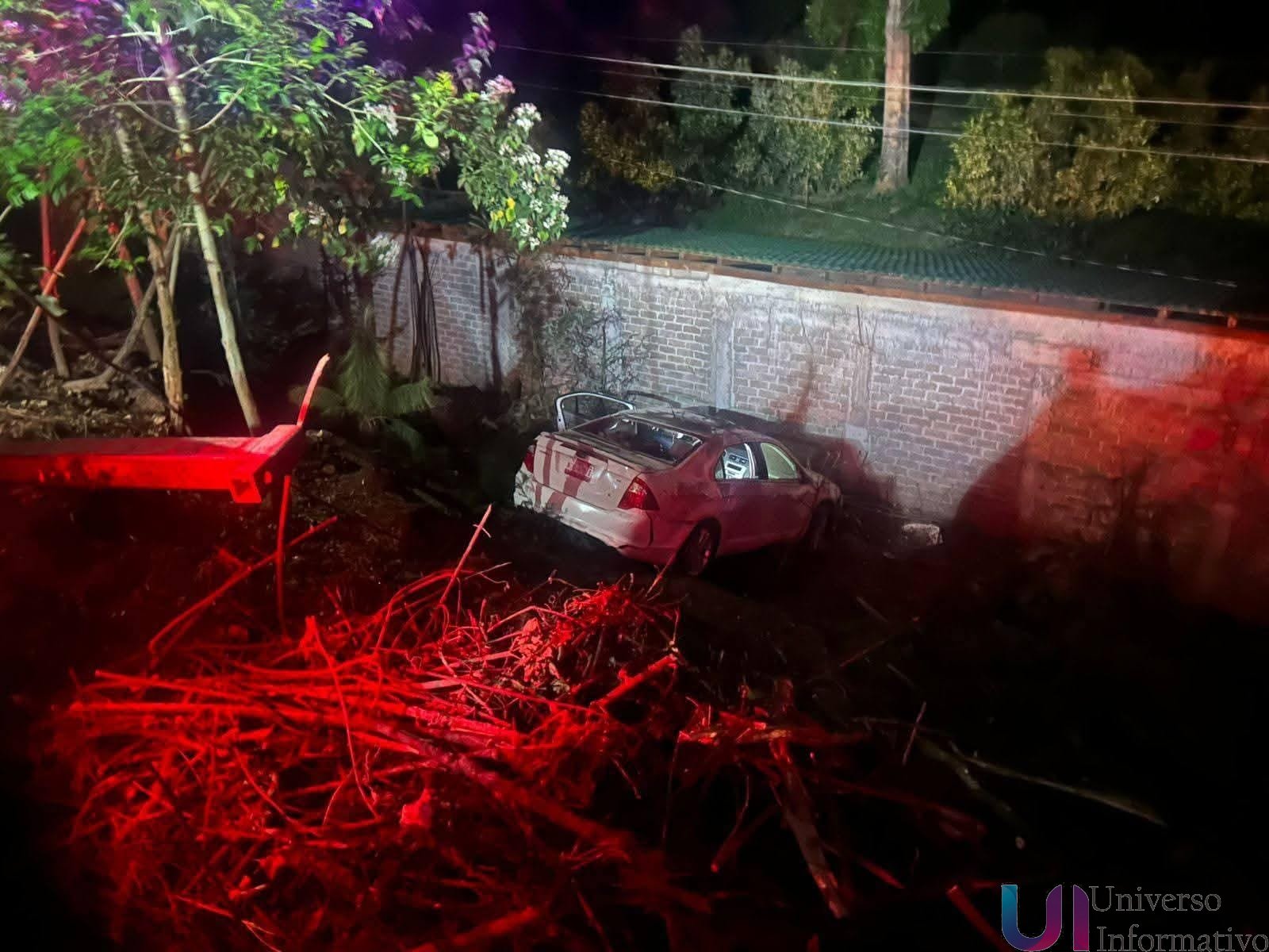 El percance ocurrió a la altura de la entrada a la comunidad Piedra del Molino, donde el conductor de un Ford Fusion modelo 2012, color gris, perdió el control al tomar una curva y se precipitó aproximadamente cinco metros hacia una barranca, quedando detenido al impactarse contra una barda.