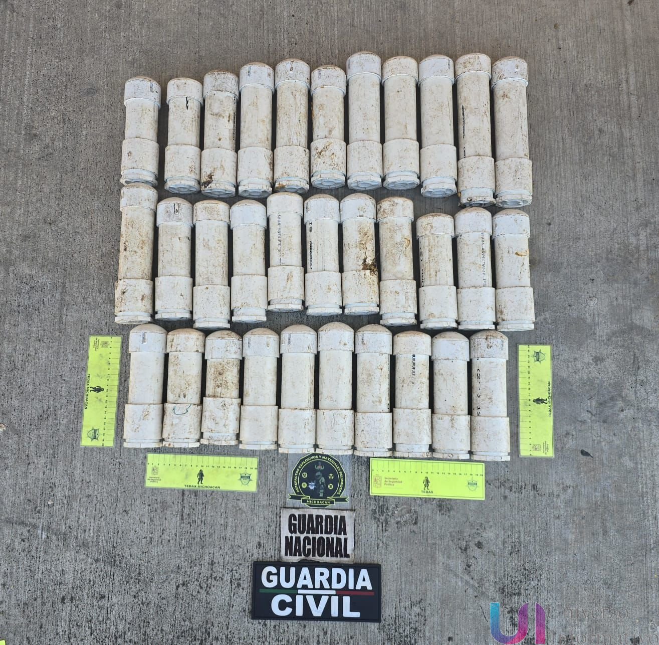 Nahuatzen, Michoacán, 16 de diciembre del 2025.- Fueron localizados en una zona serrana de la localidad de Comachuén: dos artefactos explosivos, 32 granadas modificadas para ser lanzadas con drones, una carga explosiva de 350 gramos, y seis porciones de material, sistemas de iniciación y precursores hechizos para la elaboración de explosivos.