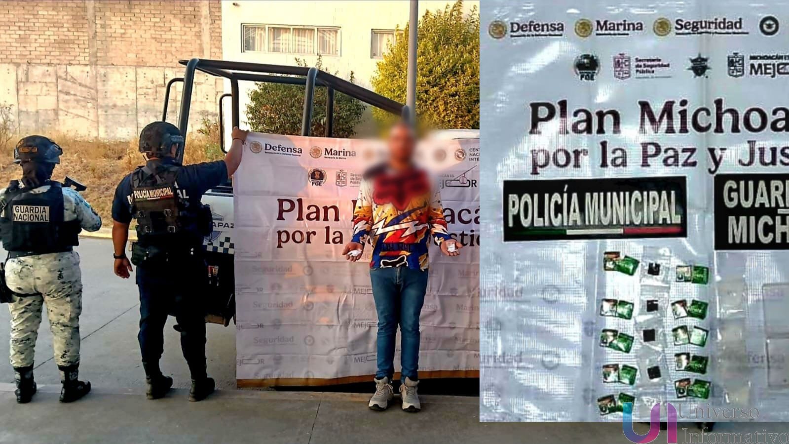 Zamora, Michoacán, 8 de enero de 2026.– Como parte de las acciones de seguridad implementadas a través del operativo “Plan Michoacán por la Paz y la Justicia”, autoridades lograron la detención de un joven de 24 años en posesión de varias dosis de droga conocida como cristal, en esta ciudad.