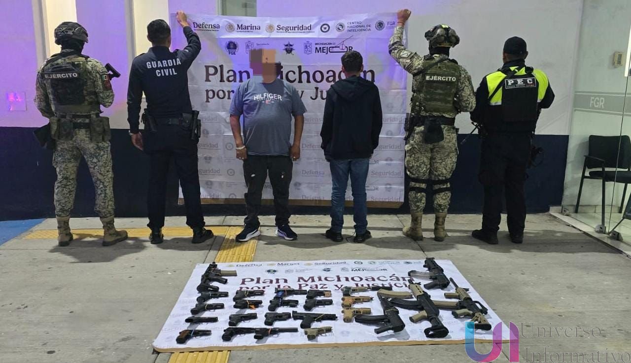 Morelia, Michoacán, 13 de enero de 2026.- Resultado del operativo interestatal y del reforzamiento a las acciones para la disuasión del delito entre Michoacán y Guanajuato, en la zona limítrofe entre ambas entidades se realizó el aseguramiento de un hombre y un menor de edad en posesión de 24 armas de fuego.