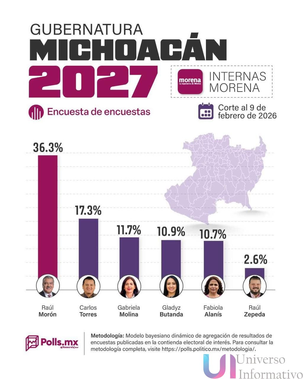 Morelia, Michoacán., a 09 de febrero de 2026.-Lo que inició como una medición de aspirantes se ha transformado en una carrera de un solo hombre. Raúl Morón sería el candidato de Morena a la gubernatura de Michoacán, según el más reciente análisis de Polls.mx, en el que el senador no solo lidera, sino que se ha vuelto matemáticamente inalcanzable para sus contrincantes.