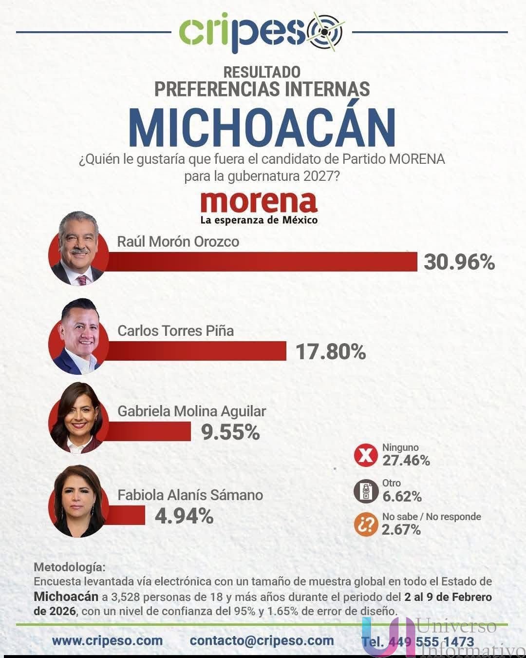 Morelia, Mich., a 13 de febrero de 2026.-Raúl Morón Orozco se perfila para ser el coordinador estatal de Defensa de la 4T en Michoacán, al registrar una ventaja de 2 a 1 en las preferencias sobre su más cercano rival, Carlos Torres Piña, de acuerdo a la encuesta más reciente de la firma Cripeso.
