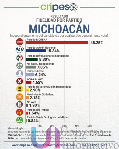 El estudio de Cripeso también midió la fidelidad de voto en la entidad, en donde Morena cuenta con una sólida base del 48.25%. Muy por detrás se encuentran el PAN con 15.34%, el PRI con 8.30% y la opción de candidatos Independientes con un 6.24%.