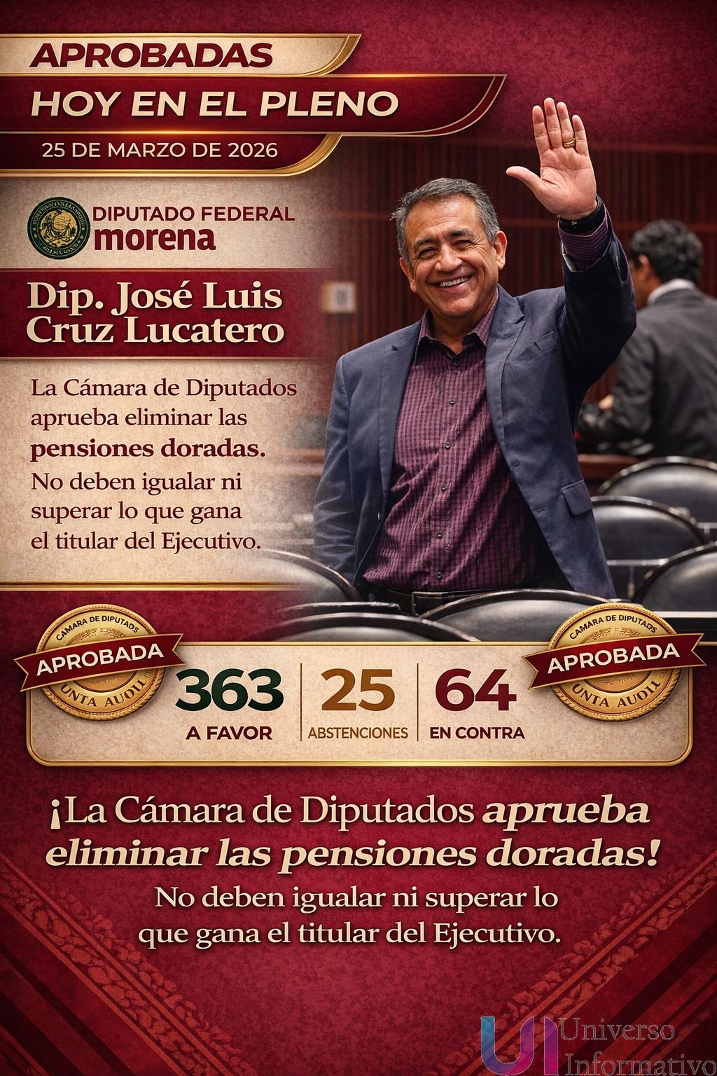 El Pleno de la Cámara de Diputados aprobó, en lo general y en lo particular, es decir, por mayoría calificada, la reforma al artículo 127 constitucional para eliminar las llamadas “pensiones doradas” otorgadas a extrabajadores de organismos descentralizados y empresas públicas del Estado, como Petróleos Mexicanos (Pemex) y la Comisión Federal de Electricidad (CFE), informó el diputado federal José Luis Cruz Lucatero.