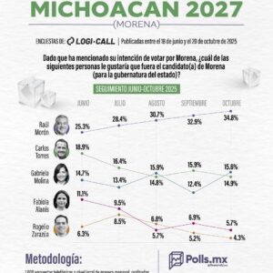 Morón, líder absoluto en contienda por candidatura de Morena por Michoacán 23 octubre, 202523 octubre, 2025 De acuerdo a Logi Call, el actual senador ha crecido cerca de 10 puntos porcentuales entre las preferencias de los […]